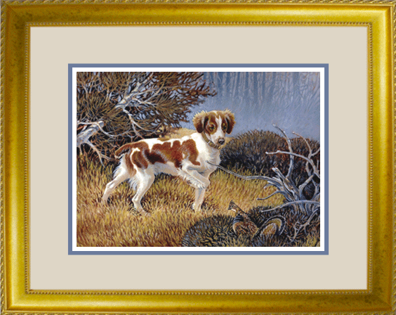 Beau the Brittany pup belongs to a friend of mine from Pennsylvania. I met John at the Southeastern Wildlife Art Expo in Charleston, South Carolina, and he was looking for somebody to paint a portrait. I could tell he was very pleased with his young dog and he described him like a proud parent would. He had photographs of Beau in several poses and I chose this one for my subject. The photograph didn’t show what Beau was pointing, so I added the grouse in the lower corner. Beau is probably old by now, but I’ll bet he has enjoyed many hunts in Greene County in the great grouse country of Southeastern Pennsylvania.