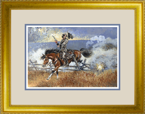 In the heat of battle, a charging cavalryman urges his mount over a split rail fence and into a barrage of hostile cannon fire. A proud member of the 1st Virginia Cavalry, he has grown accustomed to the stresses of conflict in this War Between the States. His regiment has taken part in over two hundred battles and skirmishes, including those at Bull Run, Gettysburg, Cold Harbor, and Five Forks. Great Civil War officers such as J.E.B. Stuart, “Fitz” Lee, and John Singleton Mosby have been tested and proven with this unit in these best known battles of the Civil War.