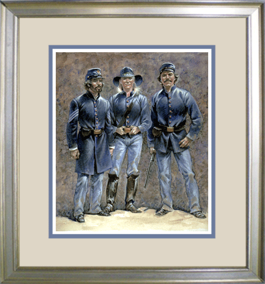 In the last twenty years I have noticed an increased interest in American history. Large groups of amateur historians study a particular period of the past and equip themselves with the clothing, weapons, and camping gear that would have been used during their chosen era. Businesses have been established to supply the increasing demand for reproductions of every imaginable item used by the soldiers and civilians that live in the pages of American history. Many Revolutionary War enthusiasts wear the tricorn hats, carry the “Brown Bess” muskets of the Colonial soldier, and gather at historic sites to recreate the battles of the Revolution. A great number of men, women, and children have an interest in the Civil War and invest much effort in buying or creating the uniforms, guns, and gear to outfit their families and even their horses with the most authentic equipment possible. Along with my own research, I have benefited from the work of the reenactors and have used many of them in creating artwork showing a historic person or event, and the three young men wearing their Union Army blues in this painting agreed to allow me to photograph them at one of their annual battle recreations.