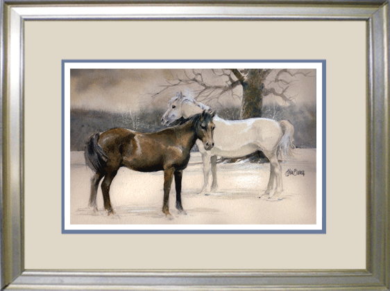 The Ohio Valley has an agreeable climate for most of the year, but in the short dark days of January and February, the snow and cold would appear to be difficult for wildlife and for the domestic animals that must stay outside. The two horses in this open field, like the deer, bear and smaller wild creatures of the woods, with thicker coats to ward off the cold and darker colored hair and fur to absorb more of the weak winter sun’s warmth, seem content to conserve their energy and wait for the warmer days of spring.