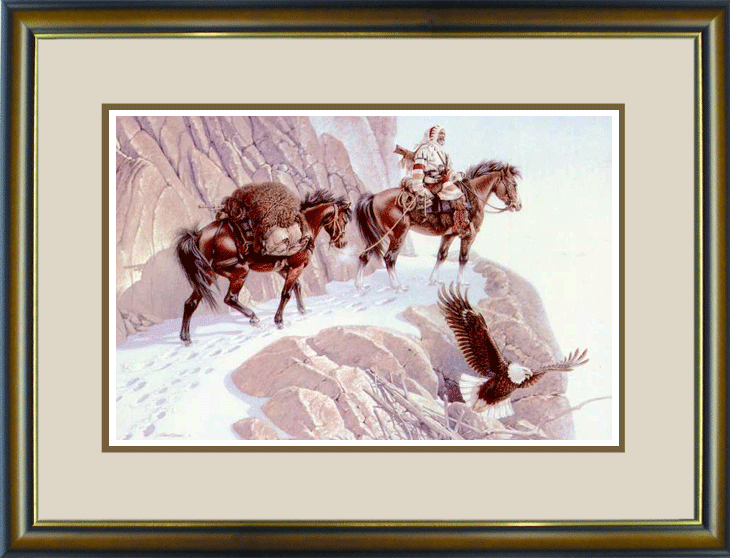 Leaving the warmth of the valley summer far below, a rider and his horses climb the tortuous trail to Eagle Pass. The still silence is broken by heavy plodding of hooves and the sharp cry of a great bald eagle driven off his lofty perch. The cold wind whispers of danger and mingles with the horses' frozen breath as they cautiously pick a path through the permanent cover of crusty snow. This high mountain divide is a barrier that few will cross between civilization and the adventure and riches of the frontier.