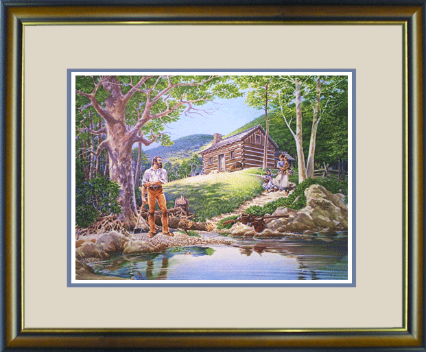 In 1814, near the point where a small stream emerges from a narrow wooded valley and flows into the Ohio River, Abraham Haynes and his wife Susannah chose a spot for their new home. Abraham, who was born in Louden County, Virginia in 1784 and Susannah, born in 1796 in New Jersey, first met in Tyler County, Virginia (now West Virginia) and lived for a time near the mouth of Big Fishing Creek in Wetzel County, Virginia (WV), before building a small log house on the hillside above a strip of rich river bottom land and the fresh waters of what is now called Haynes Run. The little cabin still stands today about a mile north of New Martinsville, and has been the inspiration for this painting.