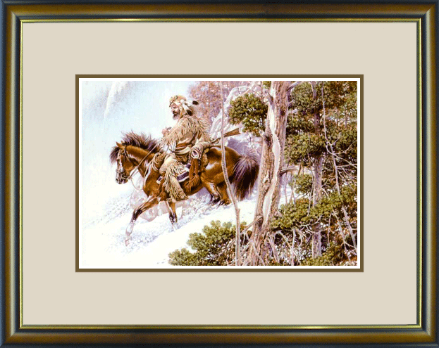 Long ago in the farthest mountain ranges of the uncharted wilderness, a lone horseman plunges through deep snow toward his campsite in the forested valley below.
