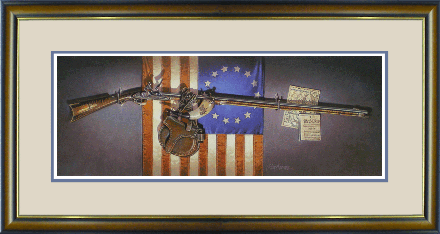 His flintlock rifle with its powder horn and pouch now hangs above the mantel, a work of art with brass inlays and scrolled carvings, but is still close at hand and can bring down game at 300 yards, or if the need should arise, can be called into service once again to protect the hard-won freedoms represented by the flag of the thirteen American colonies, and inscribed on the worn and yellowed parchment hanging nearby.