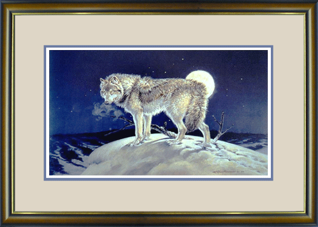 The pale yellow light from a low moon casts faint shadows and the frozen breath of a hunter hangs in the crisp mountain air. A blanket of snow was undisturbed until the soft steps of the wolf marked a path to the highest point of the ridge. The prince of predators surveys his hunting grounds.