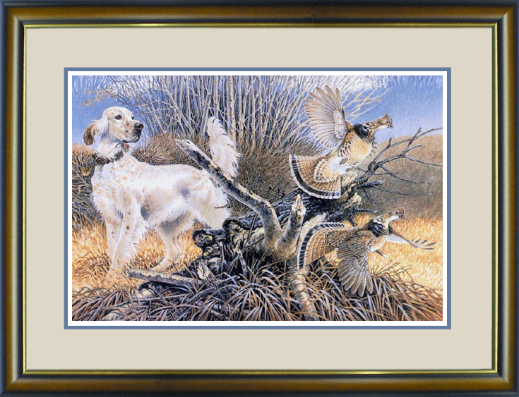 Anticipation does little to soften the surprise of a pair of grouse exploding from sparse cover at field's edge. A shock to the senses, a sudden flurry of motion blurs the vision, the eyes straining to focus on the brown birds blasting from the brush and the hearing assaulted by the sound of stiff wings beating the thin cold air in a frantic struggle to gain altitude and escape. It is with magnificent control that the classic English Setter keeps his composure, following the departing birds with head and eyes, but otherwise firm and steady as if rooted in his tracks.
